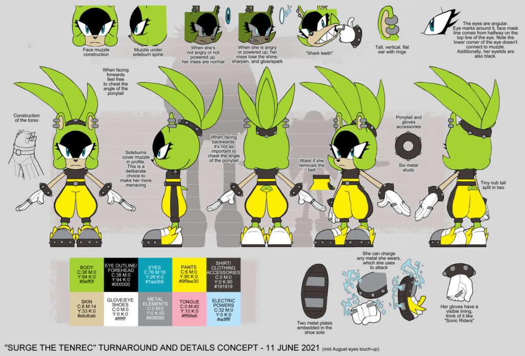 According to writer Ian Flynn, Surge was inspired by the infamous Ashura glitch from Sonic the Hedgehog 2, as well as Japanese punk fashion and anime influences like Android 18 (Dragon Ball Z).
