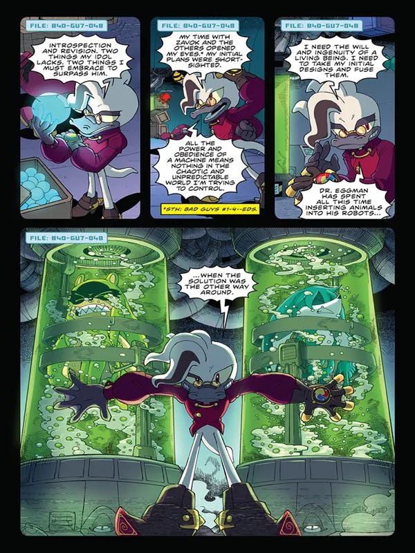 Her first proper introduction, is in the Sonic the Hedgehog: Imposter Syndrome #1, issue released in November 2021Â in between issue #47 and #48.